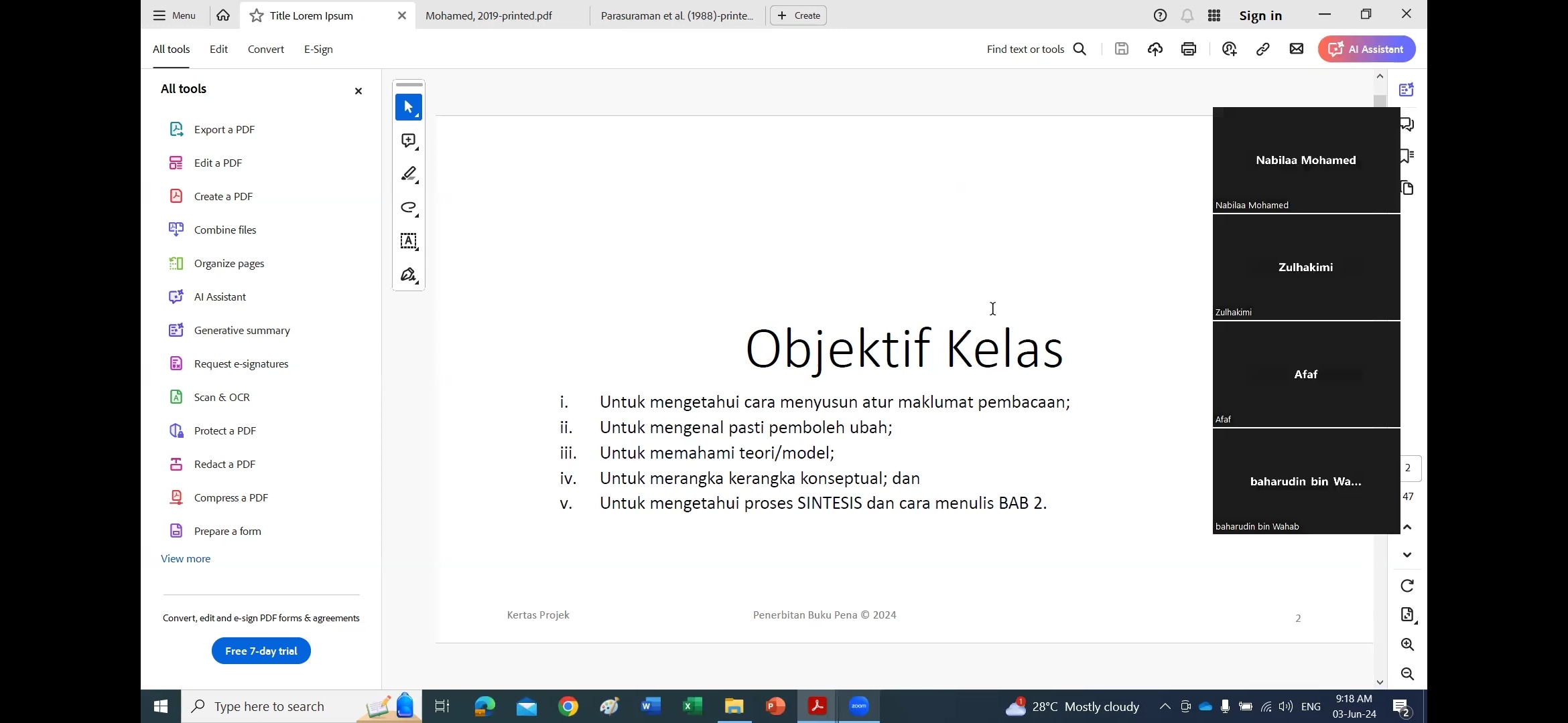 Penerbitan Buku Pena (PBP) successfully conducted its specialised online workshop, Kelas Penyediaan Kertas Projek, on Saturday, 3 June 2024. The half-day virtual class, delivered via Zoom, was designed to equip diploma and undergraduate students with the foundational techniques of preparing a research project paper (Kertas Projek), focusing on Chapter 2 – Literature Review.
